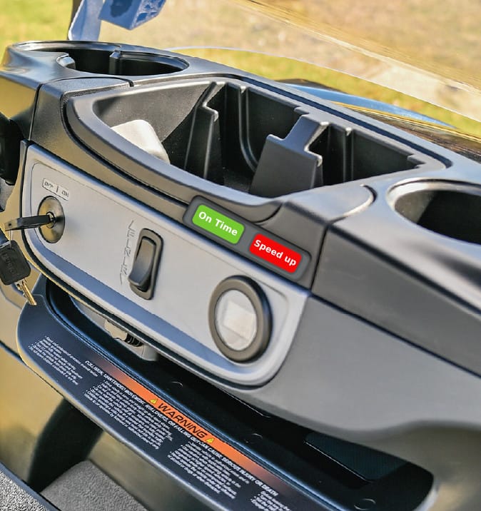 This data directly feeds a golf cart-mounted hardware system equipped with an unlimited mp3 recorded messages and optional two-color LED indicators or heavy-duty creen pads.